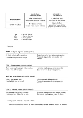Este documento explica o uso de quantificadores em inglês como "a few", "few", "a little", "little", "all", "every", "each", "both", "either", "neither", "enough" e "many/much". Fornece exemplos de como esses termos são usados com substantivos contáveis e não contáveis, e explica as diferenças de sentido entre termos como "few" e "a few", assim como regras de concordância verbal.