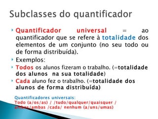 Este documento discute três tipos de quantificadores: universais, existenciais e numerais. Quantificadores universais referem-se à totalidade de um conjunto, como "todos" e "cada". Quantificadores existenciais referem-se a uma quantidade indefinida dentro de um conjunto, como "alguns" e "vários". Quantificadores numerais expressam quantidades precisas, como números ou frações.