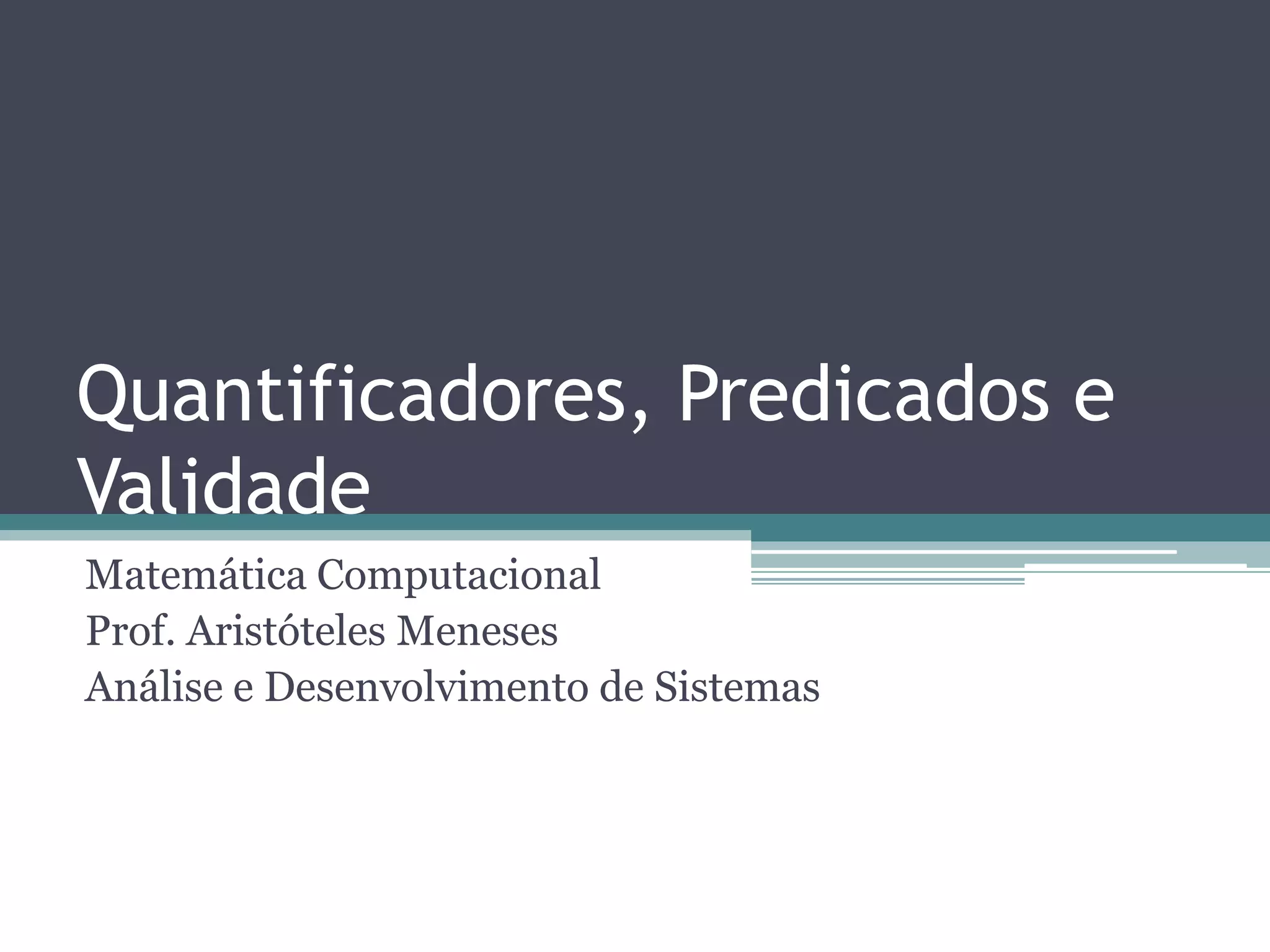 O documento discute quantificadores, predicados e validade em lógica matemática. Explica que quantificadores como "para todo" e "para algum" se referem a propriedades de objetos. Predicados descrevem essas propriedades. A validade de uma expressão lógica depende se é verdadeira sob todas as interpretações possíveis dos quantificadores e predicados.