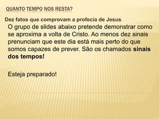 O documento lista 10 sinais bíblicos dos tempos finais, incluindo: 1) falsos cristos, 2) grandes guerras, rumores de guerra, fomes e terremotos aumentando, 3) escândalos, traições e ódio crescendo, 4) falsos profetas se multiplicando, 5) iniqüidade aumentando, 6) amor esfriando entre as pessoas, 7) evangelho sendo pregado em todo o mundo, 8) Israel se tornando uma nação novamente em 1948 cumprindo profecias bíblicas. O document