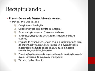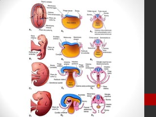 1) O documento descreve as principais etapas do desenvolvimento embrionário humano entre a 4a e 8a semana de gestação, quando se formam a maioria dos órgãos e sistemas. 2) Durante esse período ocorrem processos como dobramento, formação dos três folhetos embrionários e diferenciação dos principais órgãos. 3) Qualquer exposição a teratógenos nesse período pode causar graves anomalias congênitas, já que a maioria dos órgãos se forma entre a 4a e 8a semana.