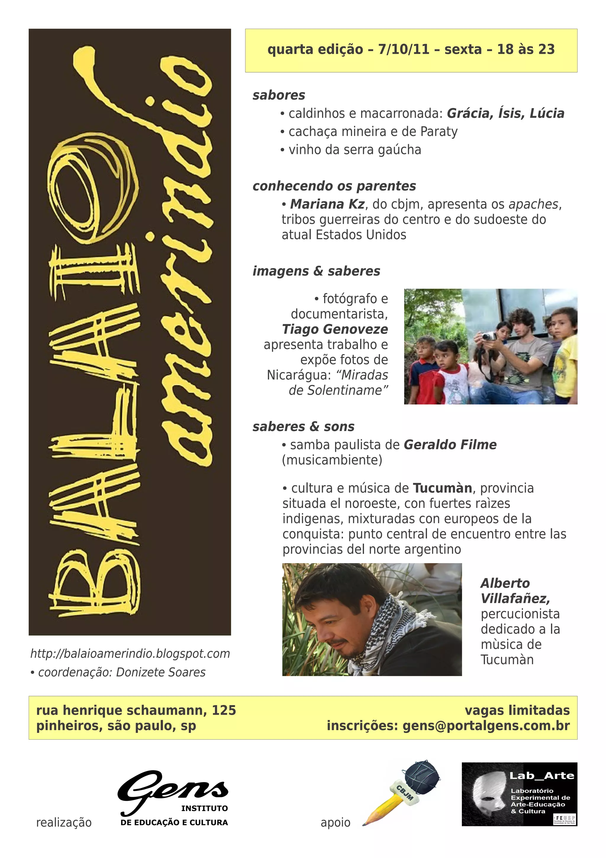 O documento anuncia os eventos de uma sexta-feira entre 18h e 23h, incluindo caldos, macarronada e bebidas típicas. Apresentações sobre cultura indígena americana, fotografias da Nicarágua e música do samba paulista e da província argentina de Tucumán.