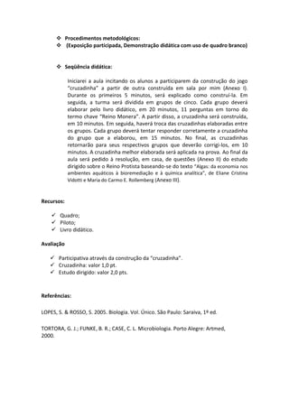 2) A aula será realizada por meio de uma atividade lúdica de construção de uma "cruzadinha" sobre moneras e resolução de questões sobre o Reino Protista.