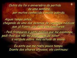 Uma senhora recebeu o diagnóstico de que tinha apenas 4 meses de vida devido a uma doença incurável. No entanto, ela decidiu usar esse tempo para se tornar uma pessoa melhor, fazendo boas ações diárias e transformando positivamente sua vida interior. Surpreendentemente, após seguir esse propósito, ela viveu por mais 23 anos, provando que a cura pode vir de dentro.