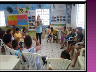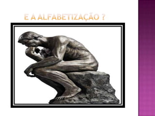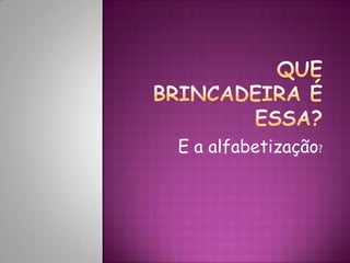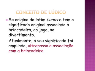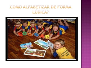O documento discute como a ludicidade pode estar presente no trabalho com a alfabetização de crianças. A ludicidade deve integrar o ensino de forma a alfabetizar de modo lúdico, por exemplo, escolhendo textos interessantes e realizando atividades como jogos que desenvolvem a consciência fonológica. Projetos e sequências didáticas que envolvam a produção de textos também podem ser formas lúdicas de trabalhar a alfabetização.