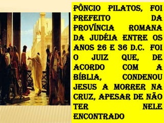 Pilatos foi o prefeito romano que condenou Jesus à morte na cruz, apesar de achar que ele era inocente. De acordo com registros históricos, Pilatos caiu em desgraça com o imperador Calígula e cometeu suicídio por volta do ano 37 d.C. O documento também discute as ações de Pilatos no julgamento de Jesus e como ele falhou como líder ao não libertá-lo.