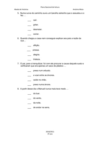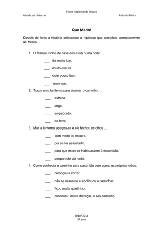O texto descreve a história de Manuel, uma criança que voltava para casa dos avós numa noite escura. Quando sua lanterna se apagou, Manuel ficou com medo no escuro até ouvir um barulho estranho que o assustou. Ao chegar em casa, explicou aos pais o susto, e seu pai o acompanhou de volta para descobrir que o barulho era apenas um saco de plástico preso em um arbusto. Depois disso, Manuel nunca mais teve medo da noite.