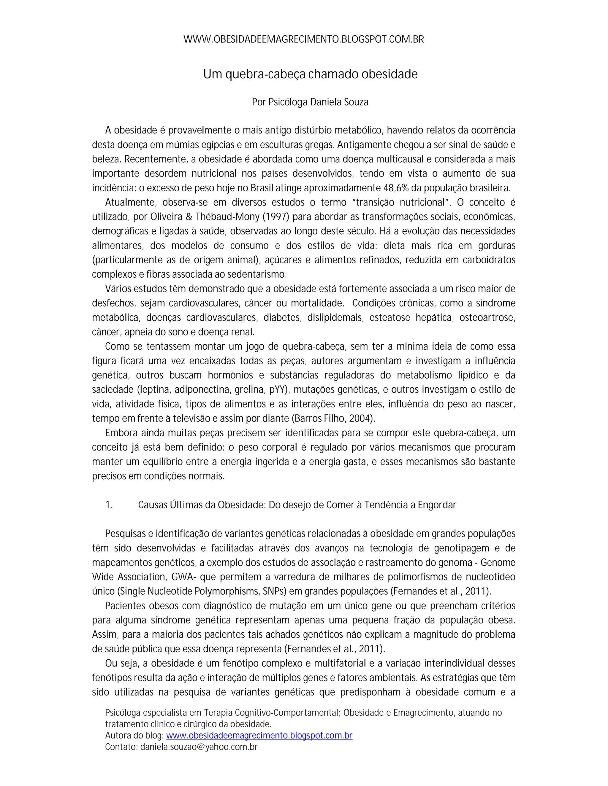 1) A obesidade é um distúrbio metabólico multifatorial influenciado por fatores genéticos, hormonais e ambientais como dieta e nível de atividade física.