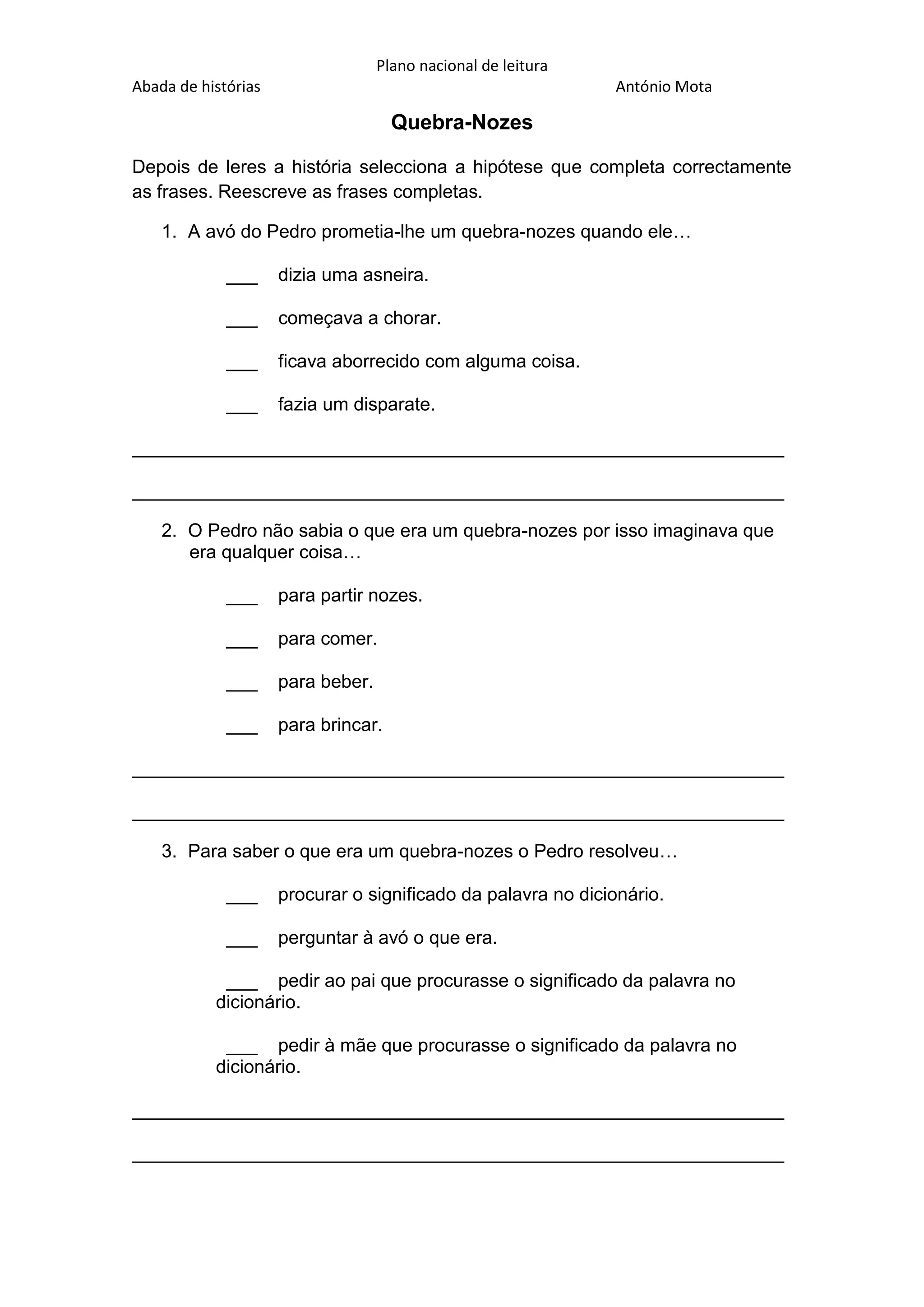 Este documento apresenta um resumo de uma história sobre um menino chamado Pedro e sua avó. A avó prometeu a Pedro um quebra-nozes se ele parasse de chorar. Pedro não sabia o que era um quebra-nozes e decidiu perguntar à avó para descobrir. Quando soube que era para partir nozes, Pedro ficou feliz e pediu um "quebra-nozes da imaginação" porque gostava de sonhar.