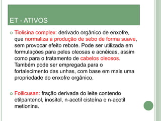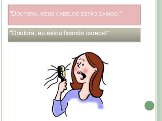 [1] O documento discute causas e tratamentos para queda de cabelo, incluindo eflúvio telógeno agudo e crônico. [2] Inclui anamnese detalhada, exame físico do couro cabeludo, exames complementares e várias opções de tratamento como suplementos vitamínicos, minerais, loções capilares e ativos naturais. [3] Também discute a importância de corrigir possíveis alterações do couro cabeludo e das hastes capilares para tratar a queda