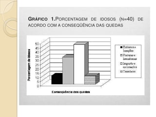 O documento discute quedas em idosos, definindo quedas e idosos. Apresenta dados sobre a população idosa no Brasil e gastos com fraturas. Discorre sobre fatores de risco intrínsecos e extrínsecos, avaliação funcional, prevenção e fisioterapia no tratamento de fraturas.