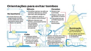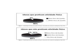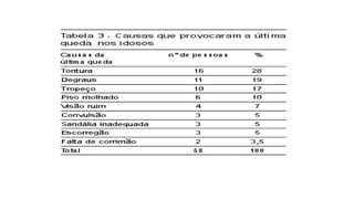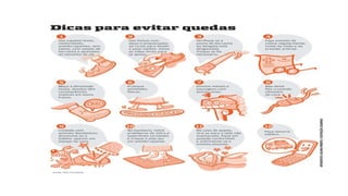O documento discute a incidência de quedas em idosos, as causas intrínsecas e fatores ambientais que contribuem para quedas, e medidas preventivas como adaptação do ambiente, exercícios físicos e educação para o autocuidado.