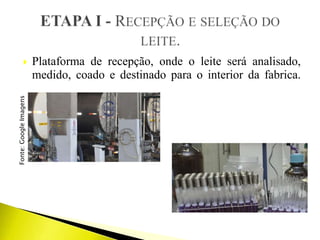 O documento descreve o processo de fabricação de queijo, incluindo a recepção e armazenamento do leite, pasteurização, adição de ingredientes, corte da massa, salga e maturação. O leite é analisado, armazenado em tanques e pasteurizado antes de iniciar o processo de fabricação do queijo.