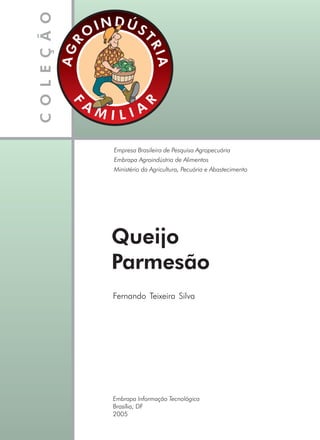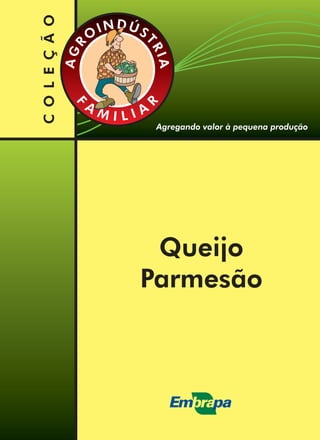 Este documento descreve as etapas do processo de produção de queijo parmesão, incluindo a pasteurização do leite, preparo do fermento, coagulação da massa, tratamento da massa, enformagem, prensagem, salga e cura. Fornece detalhes sobre os equipamentos necessários e boas práticas de fabricação para garantir a qualidade e segurança do produto final.