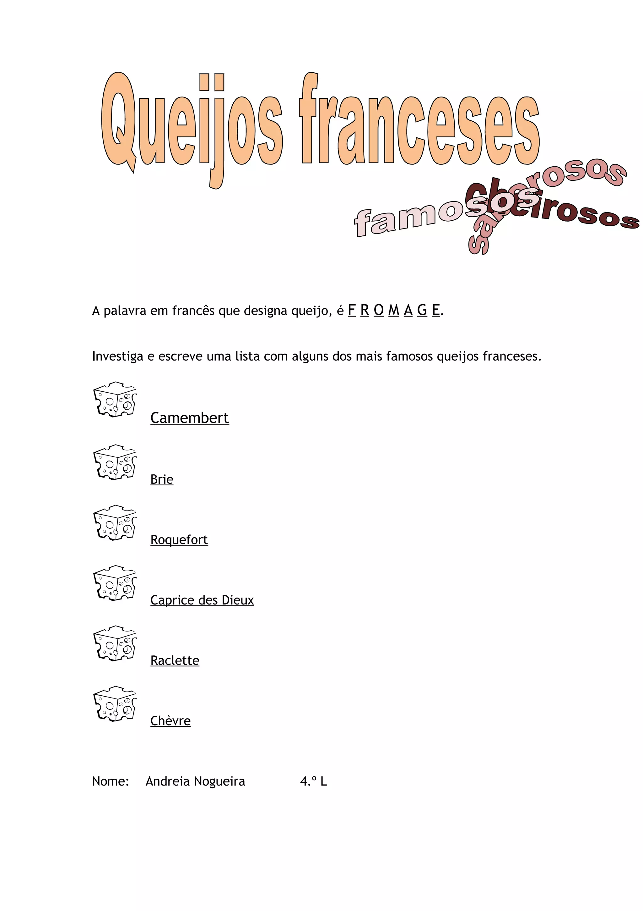 O documento apresenta a palavra francesa para queijo ("FROMAGE") e lista alguns dos queijos mais famosos da França, incluindo Camembert, Brie e Roquefort.
