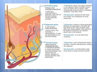 O documento descreve os diferentes graus de queimaduras, suas causas e características. Queimaduras são classificadas em primeiro, segundo ou terceiro grau dependendo da profundidade dos tecidos atingidos, podendo causar danos que vão desde vermelhidão até lesões permanentes ou morte. O texto também fornece perguntas e respostas sobre os primeiros socorros a serem prestados em caso de queimaduras leves ou com formação de bolhas.