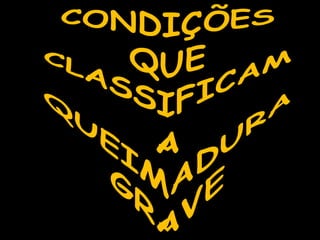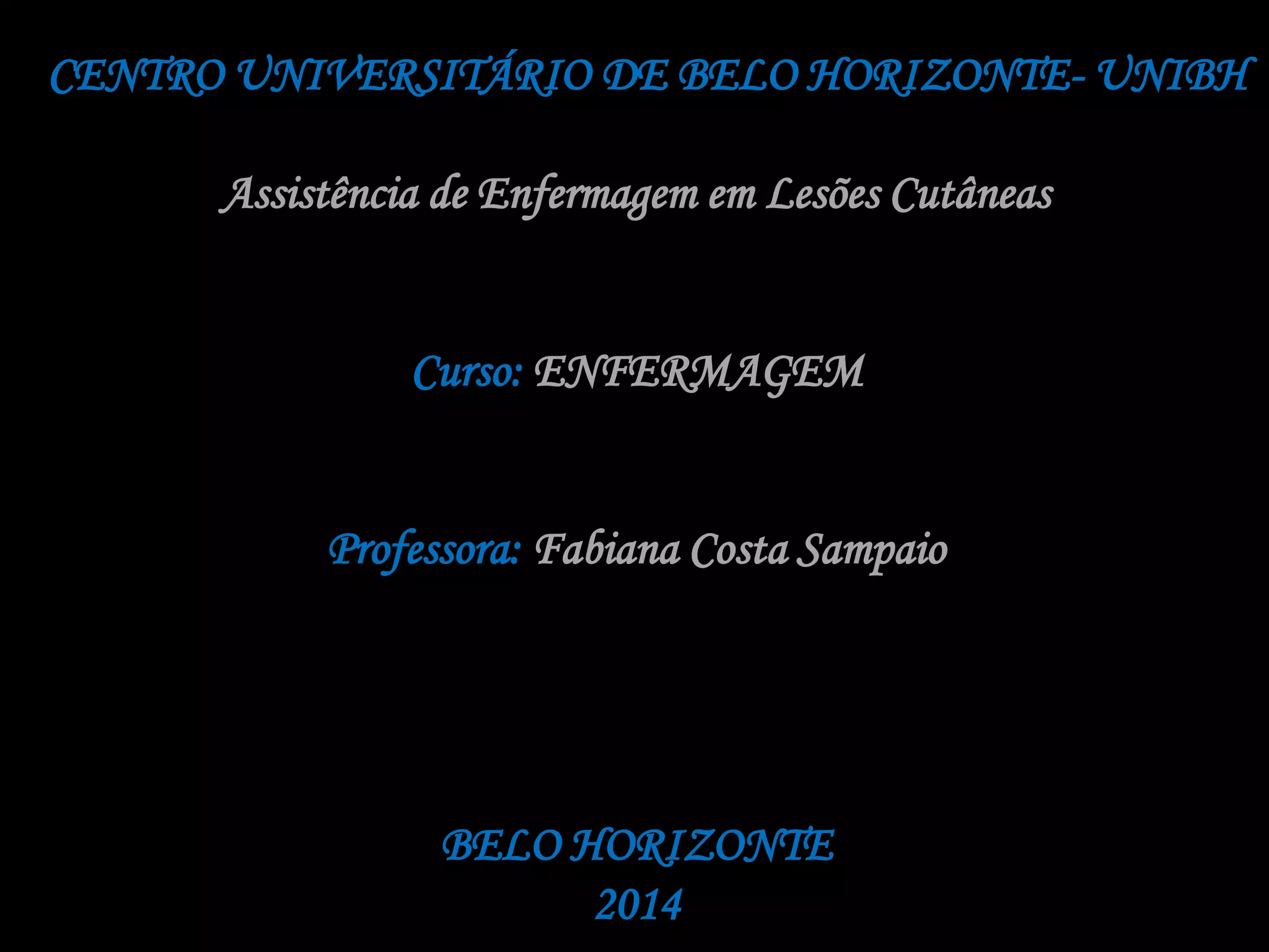 O documento discute assistência de enfermagem em lesões cutâneas, especificamente queimaduras. Apresenta os tipos de queimaduras (térmicas, químicas, elétricas e radiativas), graus de profundidade, sinais de gravidade, tratamento e complicações possíveis. Também fornece detalhes sobre avaliação, limpeza da ferida, hidratação e cuidados necessários de acordo com a gravidade da queimadura.