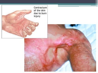 O documento fornece informações sobre queimaduras, incluindo suas causas, avaliação, tratamento inicial e cuidados. As queimaduras ocorrem quando há exposição a calor, eletricidade ou produtos químicos, danificando o tecido da pele. A extensão e profundidade da lesão determinam o prognóstico e tratamento, que variam desde cuidados ambulatoriais para queimaduras leves até hospitalização para queimaduras graves ou de segundo e terceiro graus. O atendimento inicial é crucial, envolvendo remoção da fonte