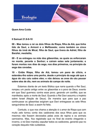 2) O texto bíblico descreve quando o rei Saul quebrou um pacto antigo com os gibeonitas, gerando um conflito. Quando Davi assumiu, os gibeonitas exigiram sete filhos de Saul em troca da paz.