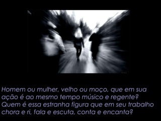O poema descreve o professor como um personagem estranho que precisa desempenhar muitos papéis ao mesmo tempo, como músico, regente, ator, malabarista e anjo. O professor precisa entusiasmar os alunos individualmente e em grupo, manter a ordem sem perder a serenidade, ouvir cada aluno e falar com todos. Além disso, o professor renova a energia, aprende empatia ensinando e confia no potencial de cada aluno.
