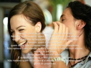 Quem Namora... Arthurda Távola Quem namora agrada a Deus. Namorar é a forma bonita de viver um amor. Não namora quem cobra nem quem desconfia. Namora, quem lê nos olhos e sente no coração as vontades saborosas do outro.