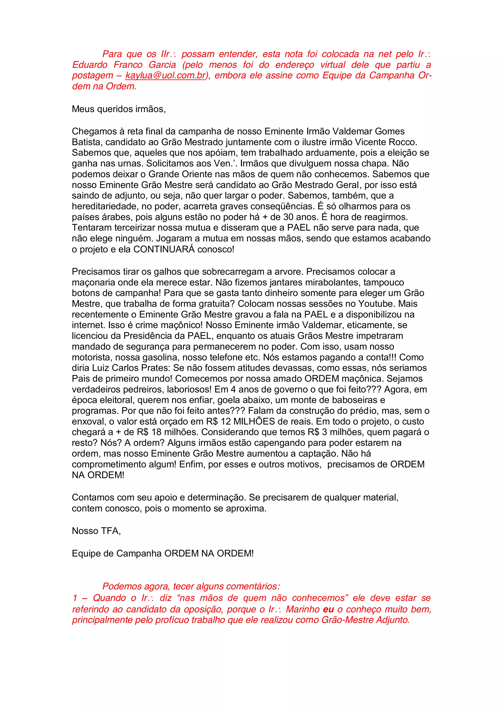 1) O email discute uma campanha eleitoral interna no Grande Oriente do Estado de São Paulo entre as chapas de Valdemar Gomes Batista e Vicente Rocco.