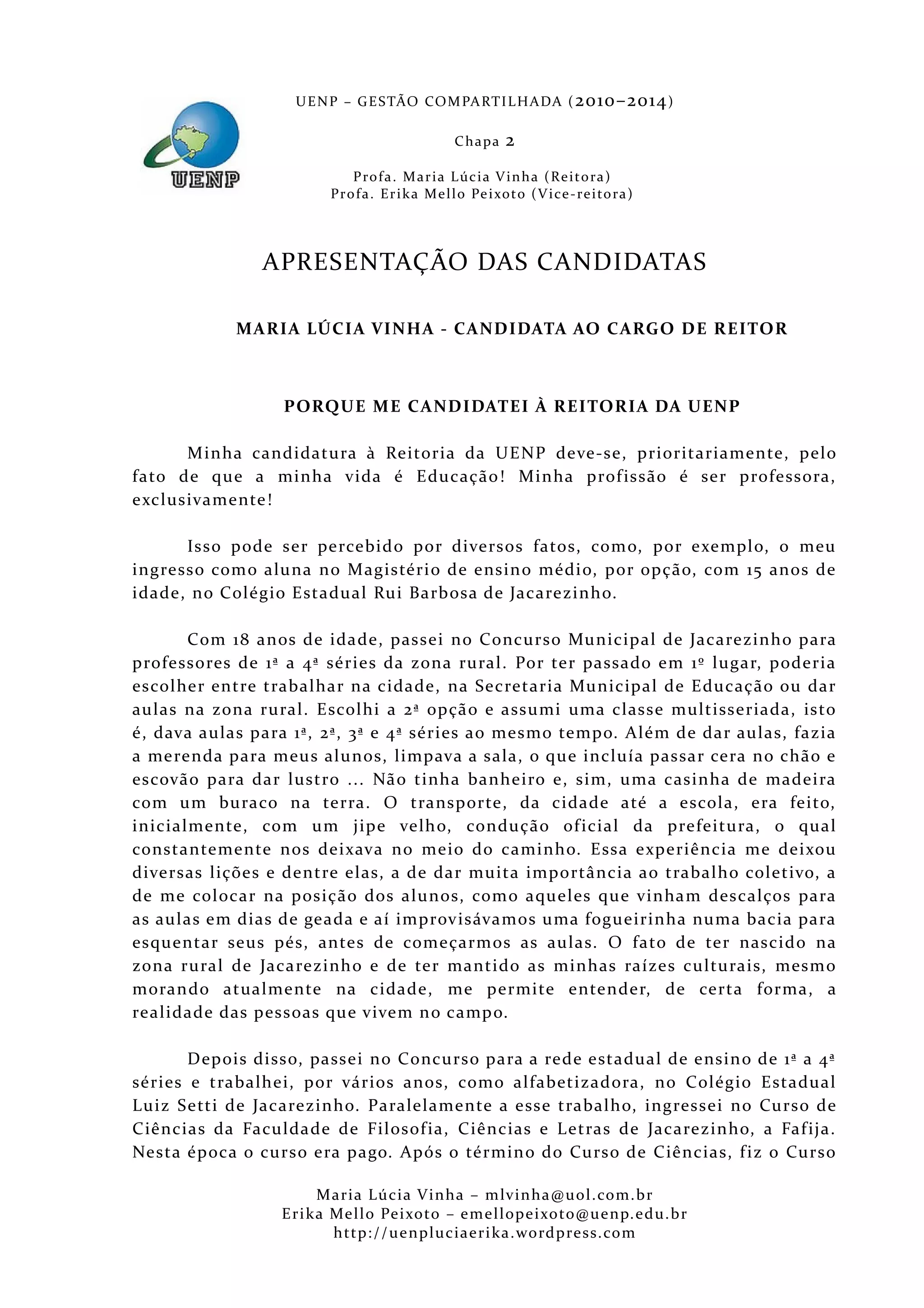 A candidata Maria Lúcia Vinha apresenta sua trajetória acadêmica e experiência na área da educação, destacando sua atuação como professora desde os 15 anos de idade. Ela defende uma gestão democrática e compartilhada na UENP, ouvindo demandas de professores, funcionários e alunos. A candidata a vice-reitora, Erika Mello Peixoto, apresenta brevemente sua formação em Medicina Veterinária e início de carreira acadêmica.