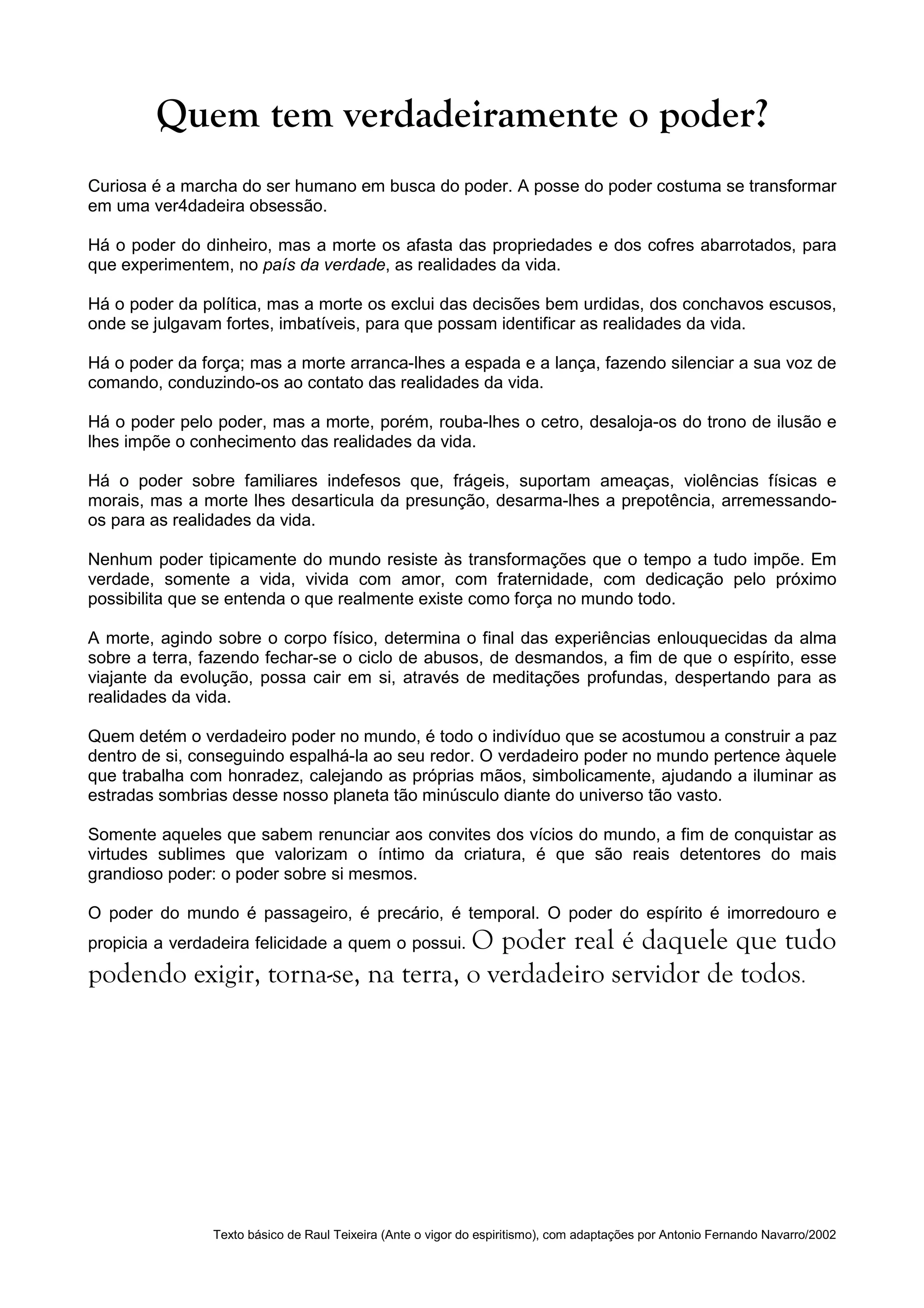 O documento discute que o verdadeiro poder não está no dinheiro, política ou força, mas na capacidade de viver com amor, compaixão e serviço aos outros. A morte iguala a todos e mostra que apenas a vida vivida com virtude traz felicidade duradoura. O poder real está naquele que serve humildemente a todos.