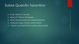 Quentin Tarantino é um diretor e roteirista americano nascido em 1963. Seus filmes se caracterizam por histórias não lineares e violência tratada de forma comum. Seus filmes mais famosos incluem Kill Bill, Pulp Fiction e Reservoir Dogs, marcados por cenas sangrentas e planos estáticos entre personagens.