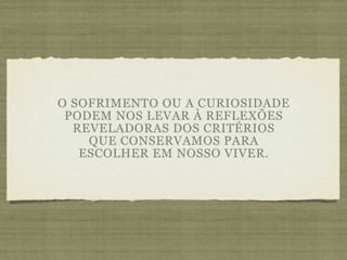 O documento explora a complexidade das escolhas pessoais e os critérios que fundamentam essas decisões. Destaca como contextos relacionais influenciam o sofrimento e as reflexões sobre o que realmente desejamos viver. A reflexão é apresentada como um meio para perceber os padrões que aplicamos em diferentes situações de nosso cotidiano.