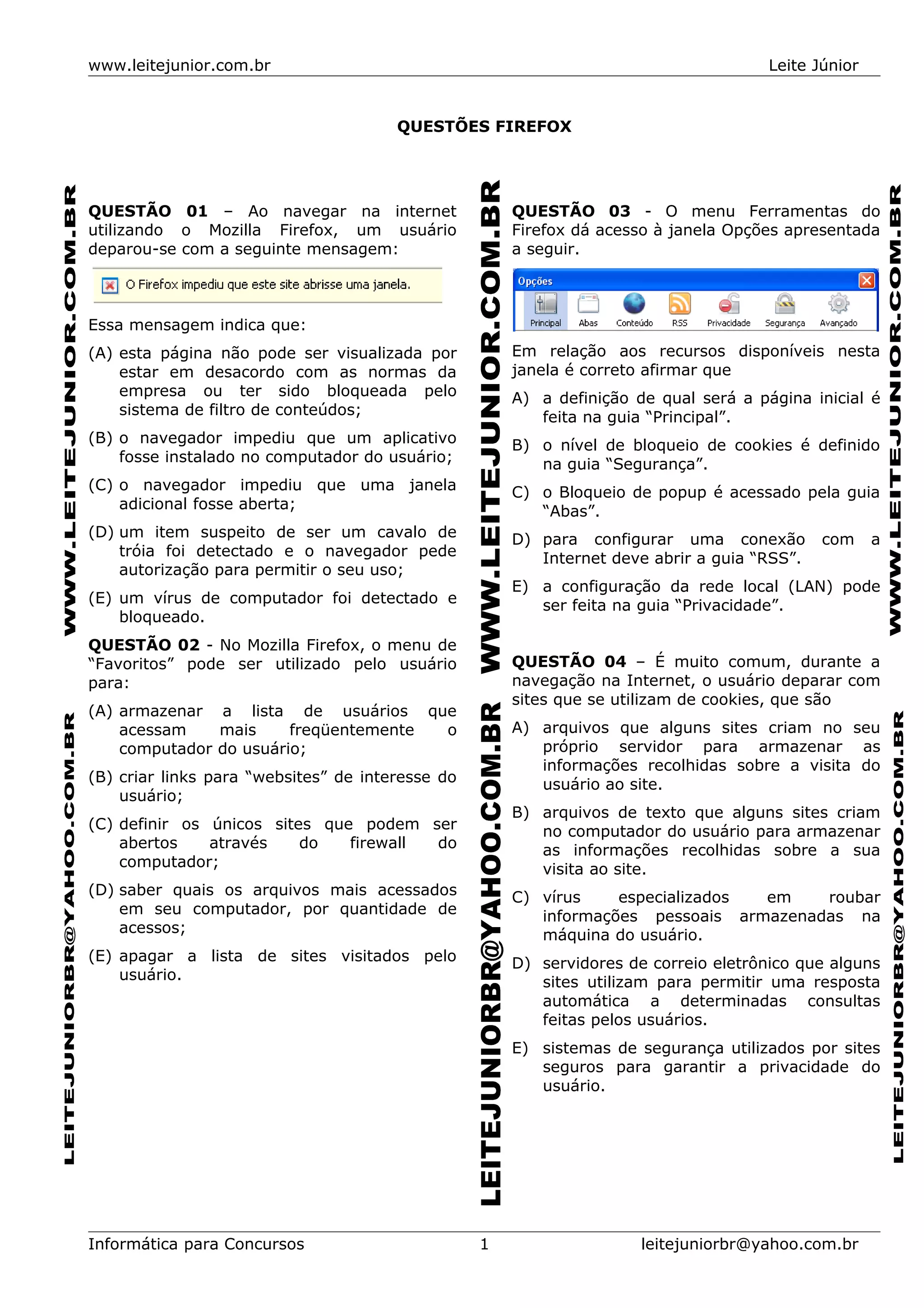 Este documento contém 11 questões sobre o navegador Mozilla Firefox abordando tópicos como mensagens exibidas durante a navegação, o uso da função de favoritos, as configurações de privacidade e segurança, cookies, plugins e a função das barras de ferramentas. O documento também fornece os gabaritos das respostas.