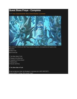 Para derrotar a Rainha do Gelo Freya, o jogador deve completar uma série de 5 quests curtas que envolvem conversar com vários NPCs, coletar itens e derrotar inimigos. Ao final, o jogador enfrenta Freya com um grupo de 10-27 pessoas para completar a instância e receber recompensas.