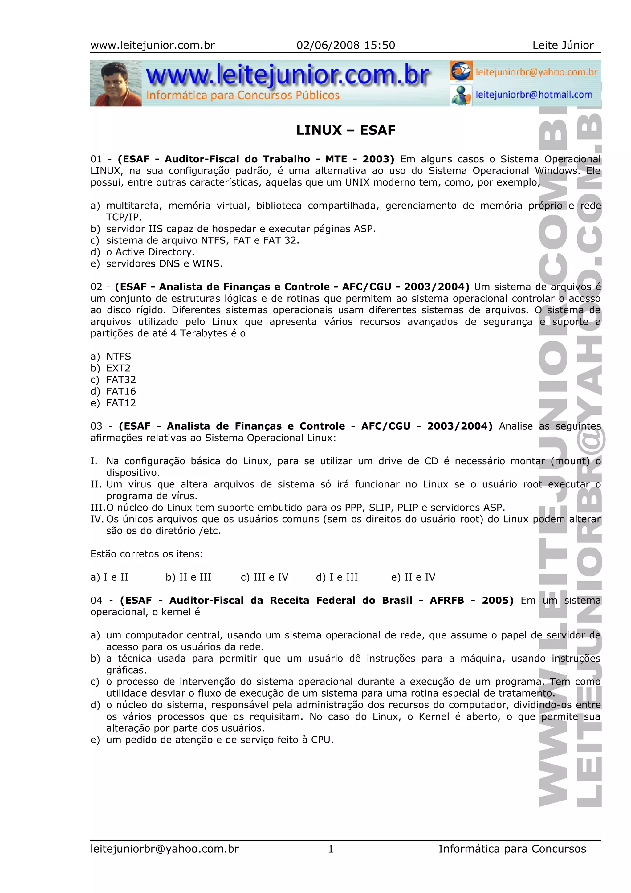 O documento discute o sistema operacional Linux, descrevendo suas principais características como multitarefa, memória virtual e sistema de arquivos EXT2. Ele também aborda comandos como "mount", "shutdown" e "ls", além de definir o kernel como o núcleo responsável por gerenciar os recursos do computador.