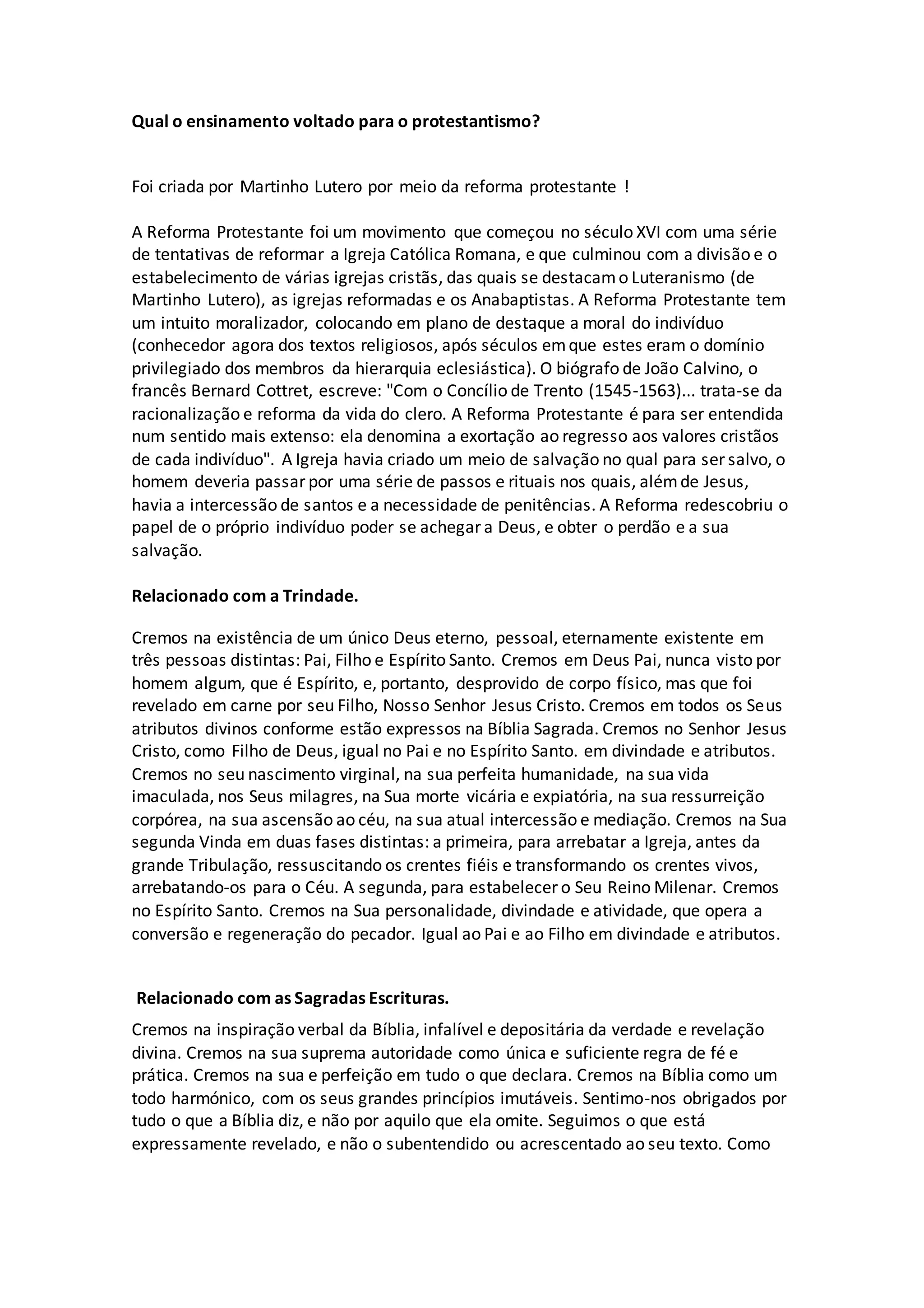 1) A Reforma Protestante foi um movimento do século XVI que buscou reformar a Igreja Católica e resultou na divisão e criação de novas igrejas como a Luterana e as Igrejas Reformadas.