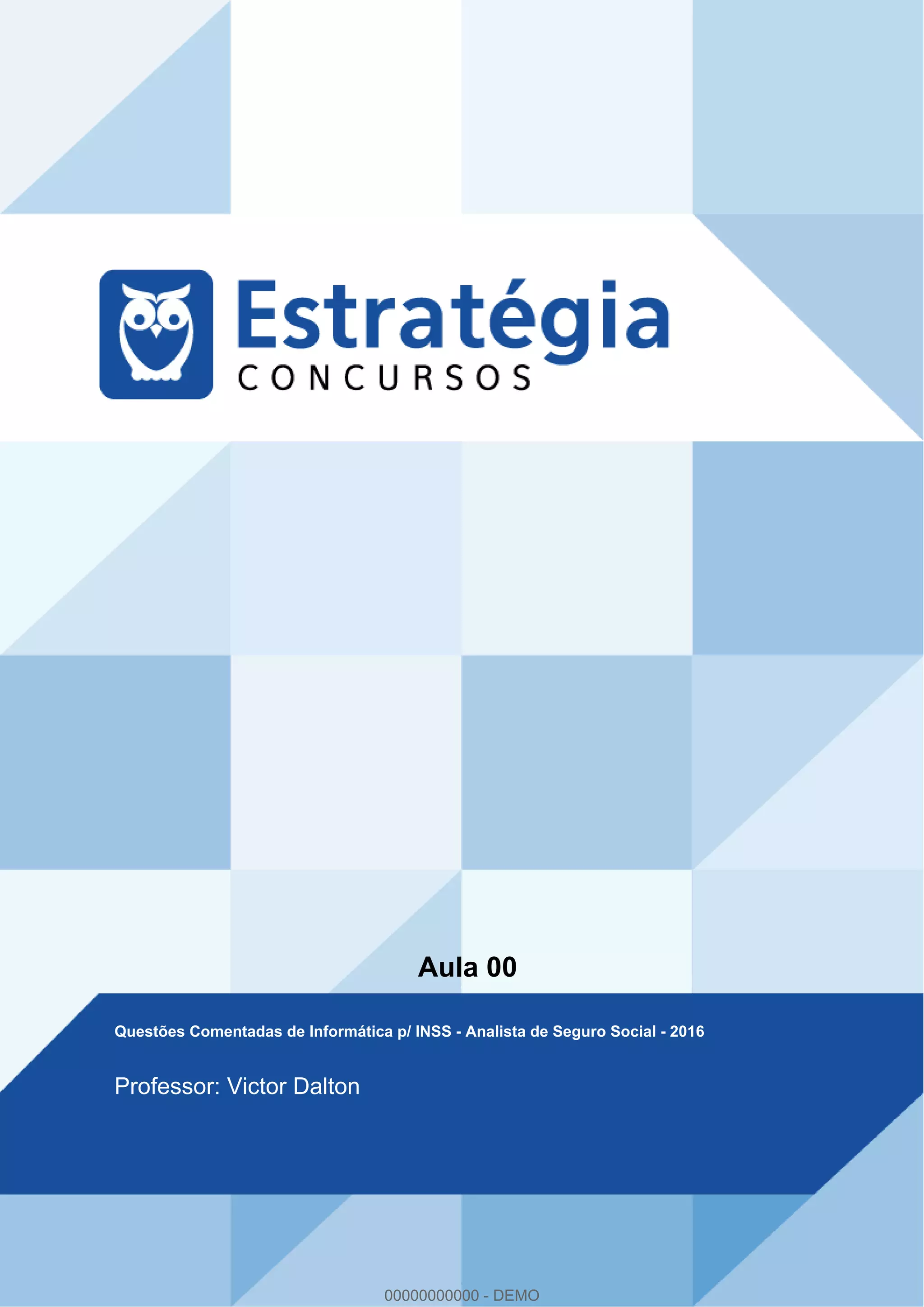 [1] O documento apresenta um curso sobre Informática para concursos do INSS, com conceitos fundamentais da área e exercícios comentados. [2] O curso será dividido em aulas sequenciais abordando temas como redes, sistemas operacionais, aplicativos de escritório e segurança da informação. [3] O professor Victor Dalton apresenta sua experiência acadêmica e profissional qualificando-o para ministrar o curso.