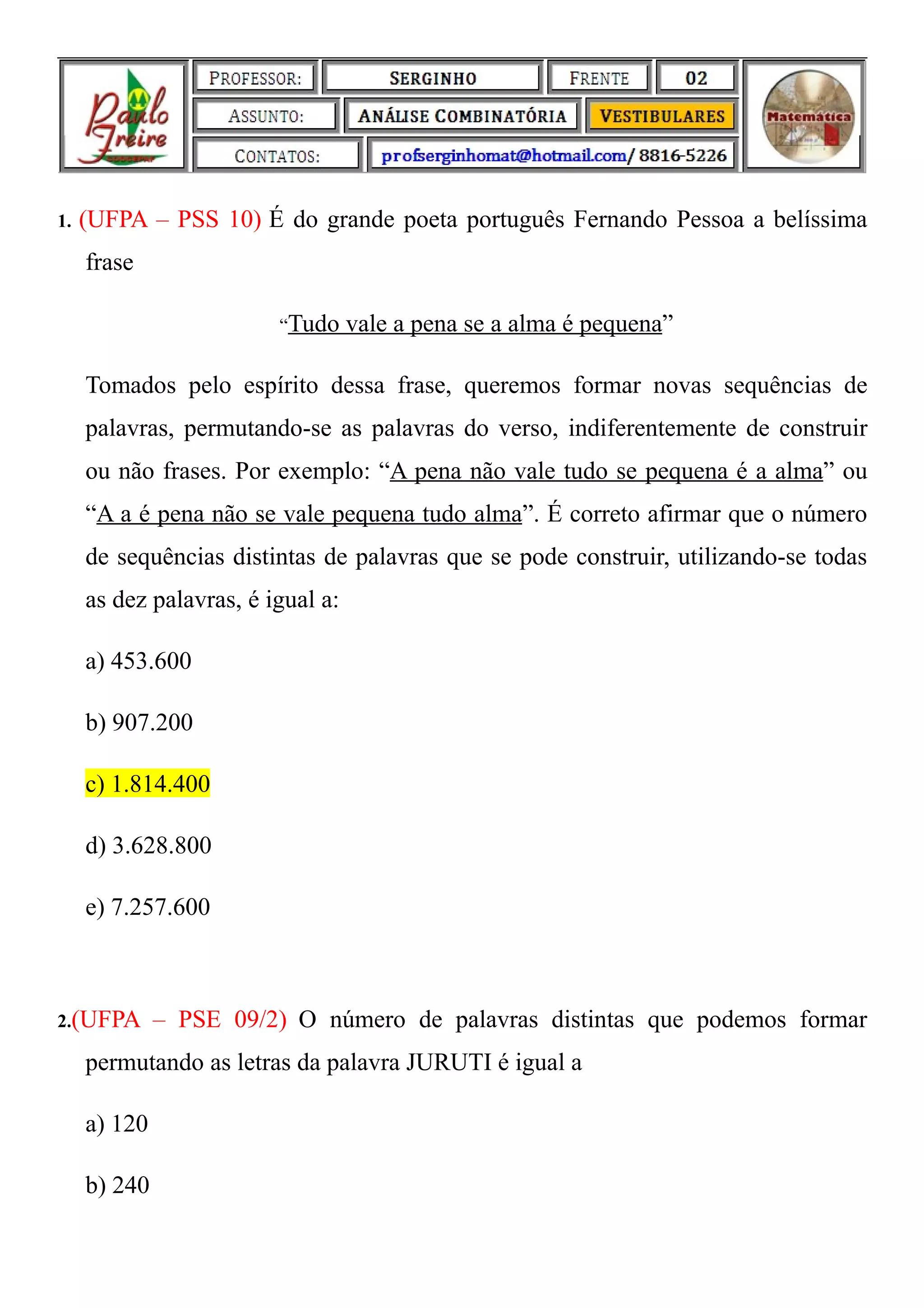 1) O documento apresenta 22 questões de raciocínio lógico e probabilidade relacionadas a combinatória e permutações. As questões envolvem cálculos de arranjos, permutações e combinações para determinar o número de possibilidades em diferentes situações.