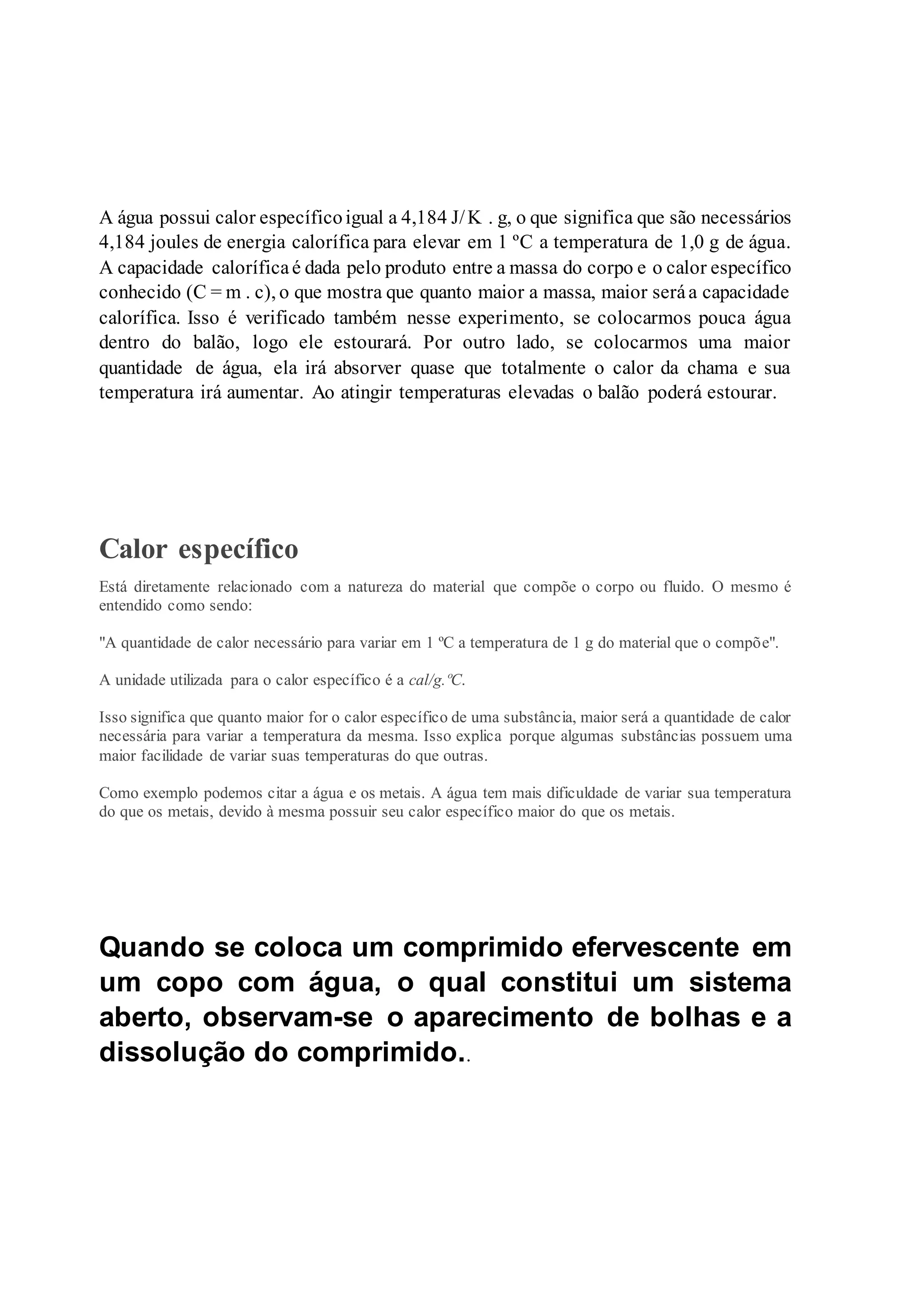 O documento discute propriedades térmicas da água, incluindo seu calor específico de 4,184 J/Kg°C e como a capacidade calorífica de um corpo depende de sua massa. Também explica que quanto maior a massa de água em um balão, mais calor ela pode absorver antes de ferver.