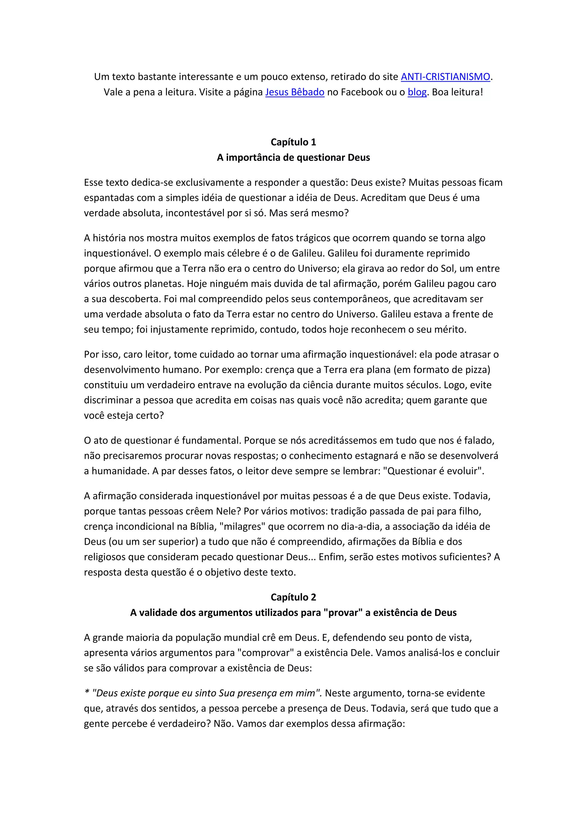 Este documento discute a validade de argumentos comumente usados para "provar" a existência de Deus. Ele analisa argumentos como a percepção pessoal de Deus, respostas às orações, e a Bíblia como prova, e conclui que nenhum desses argumentos é válido sozinho para comprovar a existência de Deus. A teoria da evolução fornece uma explicação mais convincente para a diversidade da vida do que a narrativa bíblica de Adão e Eva.