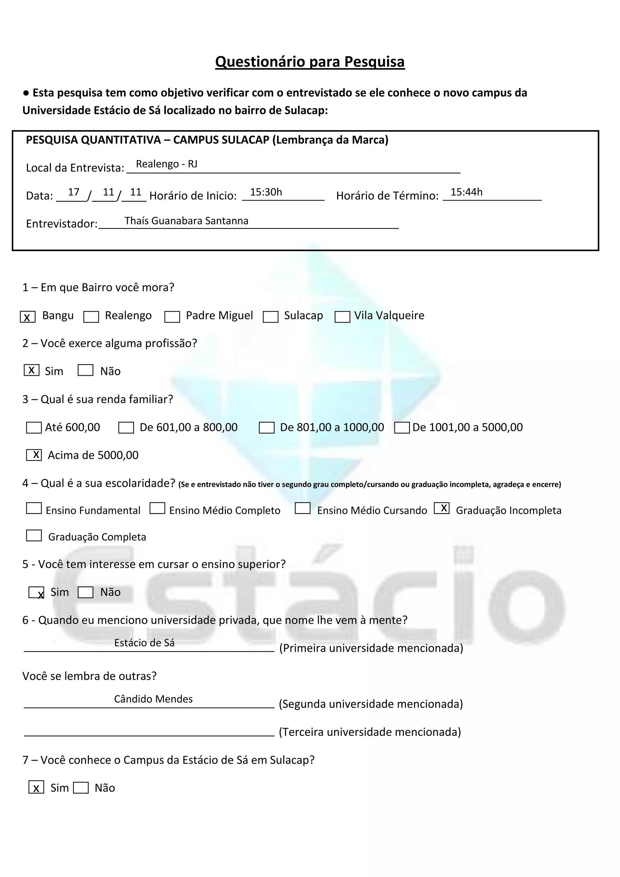 Este questionário busca avaliar o conhecimento e percepção de um entrevistado sobre o novo campus da Universidade Estácio de Sá localizado em Sulacap através de 17 perguntas. O entrevistado, uma mulher de 24 a 29 anos chamada Renata Ribeiro Neves, mora em Realengo, conhece e já visitou o campus em Sulacap e achou suas instalações boas com um atendimento também bom.