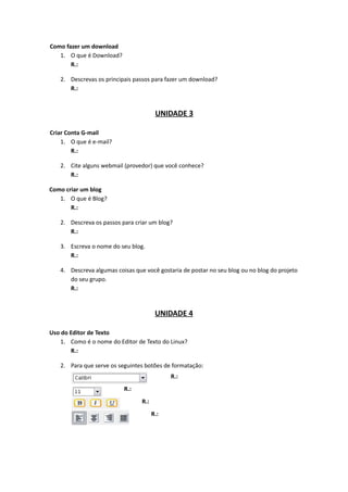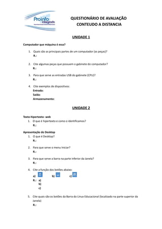 Este questionário avalia os conhecimentos sobre computadores, internet e ferramentas digitais. Aborda temas como hardware, sistema operacional, navegadores, redes sociais, produção e edição de conteúdo online. Inclui perguntas sobre partes do computador, uso do desktop, downloads, criação de e-mail e blog, editor de texto, planilhas eletrônicas e apresentações.