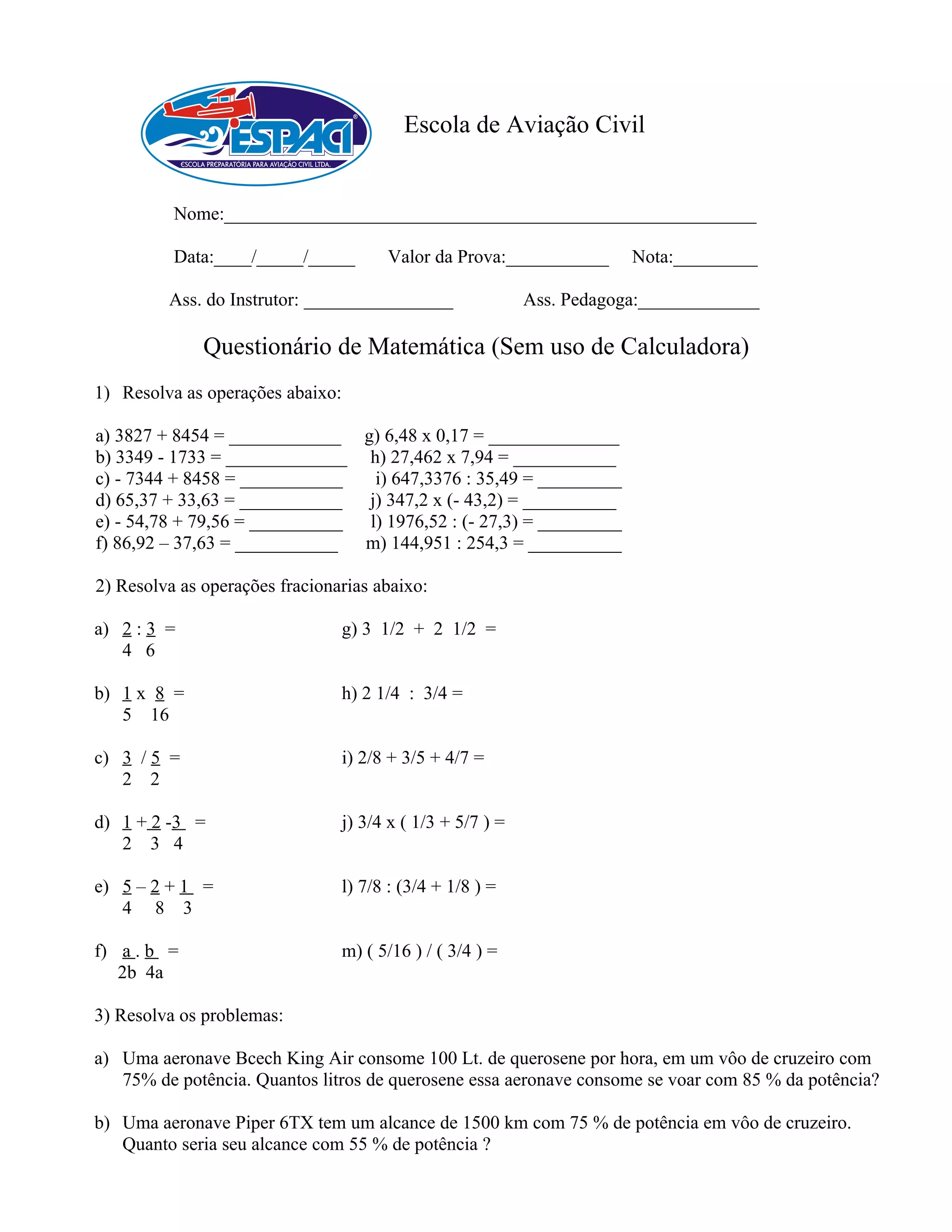 O documento apresenta um questionário de matemática para avaliação de alunos de aviação civil, contendo questões sobre operações matemáticas, frações, potências, áreas, volumes e conversões de unidades.