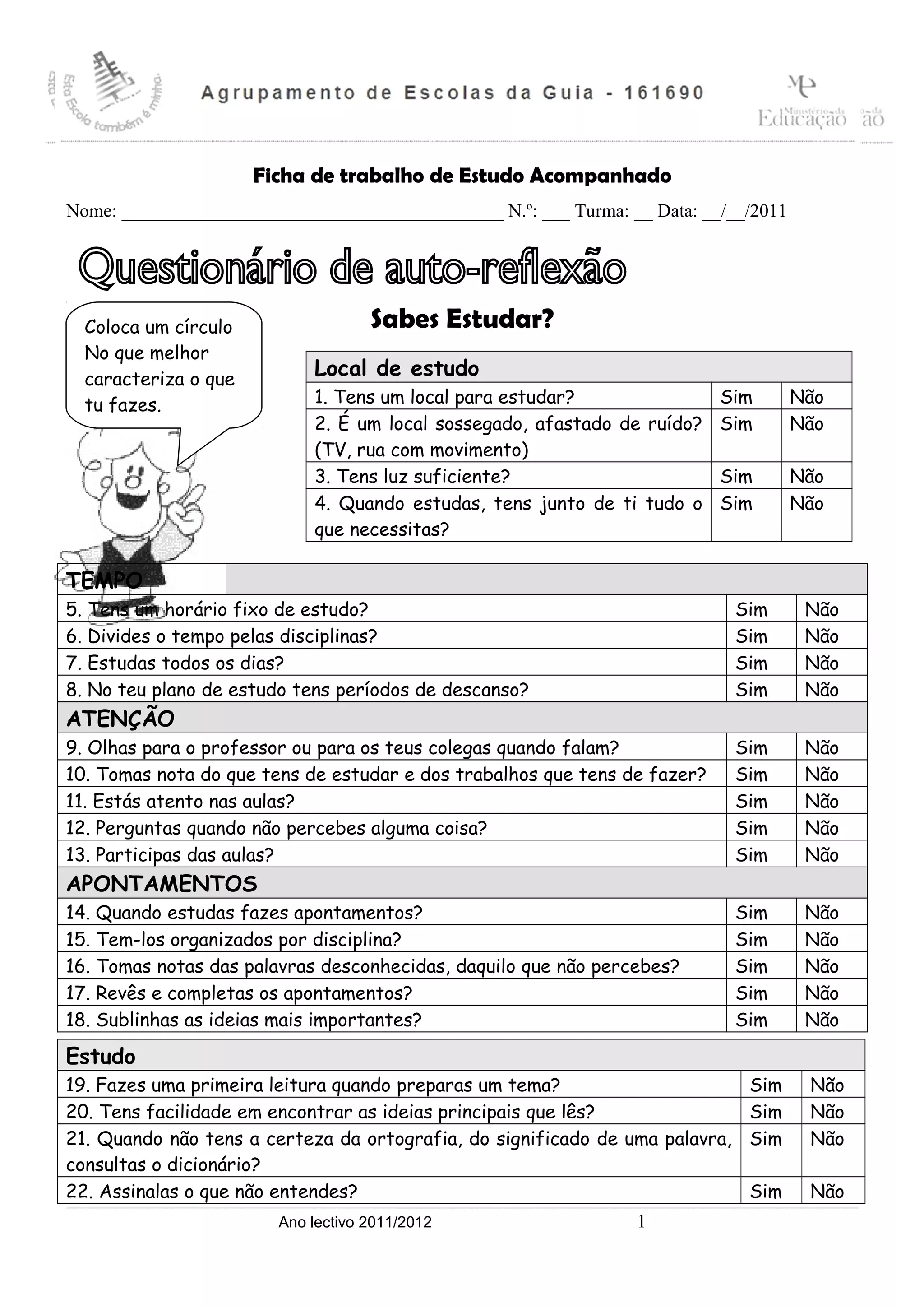 Este documento é uma ficha de autoavaliação sobre hábitos e estratégias de estudo. Contém perguntas sobre o local de estudo, gestão do tempo, atenção nas aulas, tomada de notas, compreensão do material, elaboração de esquemas e habilidades de investigação. O objetivo é ajudar os estudantes a avaliarem suas próprias práticas de estudo e identificarem áreas que podem ser melhoradas.