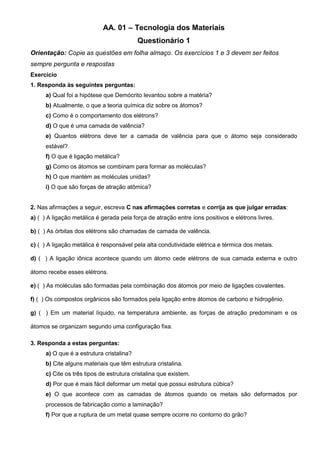 O documento apresenta perguntas sobre conceitos básicos de tecnologia dos materiais, incluindo: 1) a teoria atômica de Demócrito e propriedades dos átomos e elétrons, 2) tipos de ligação entre átomos como metálica e iônica, 3) formação de moléculas e forças entre elas, e 4) estrutura cristalina de materiais e deformação em metais.