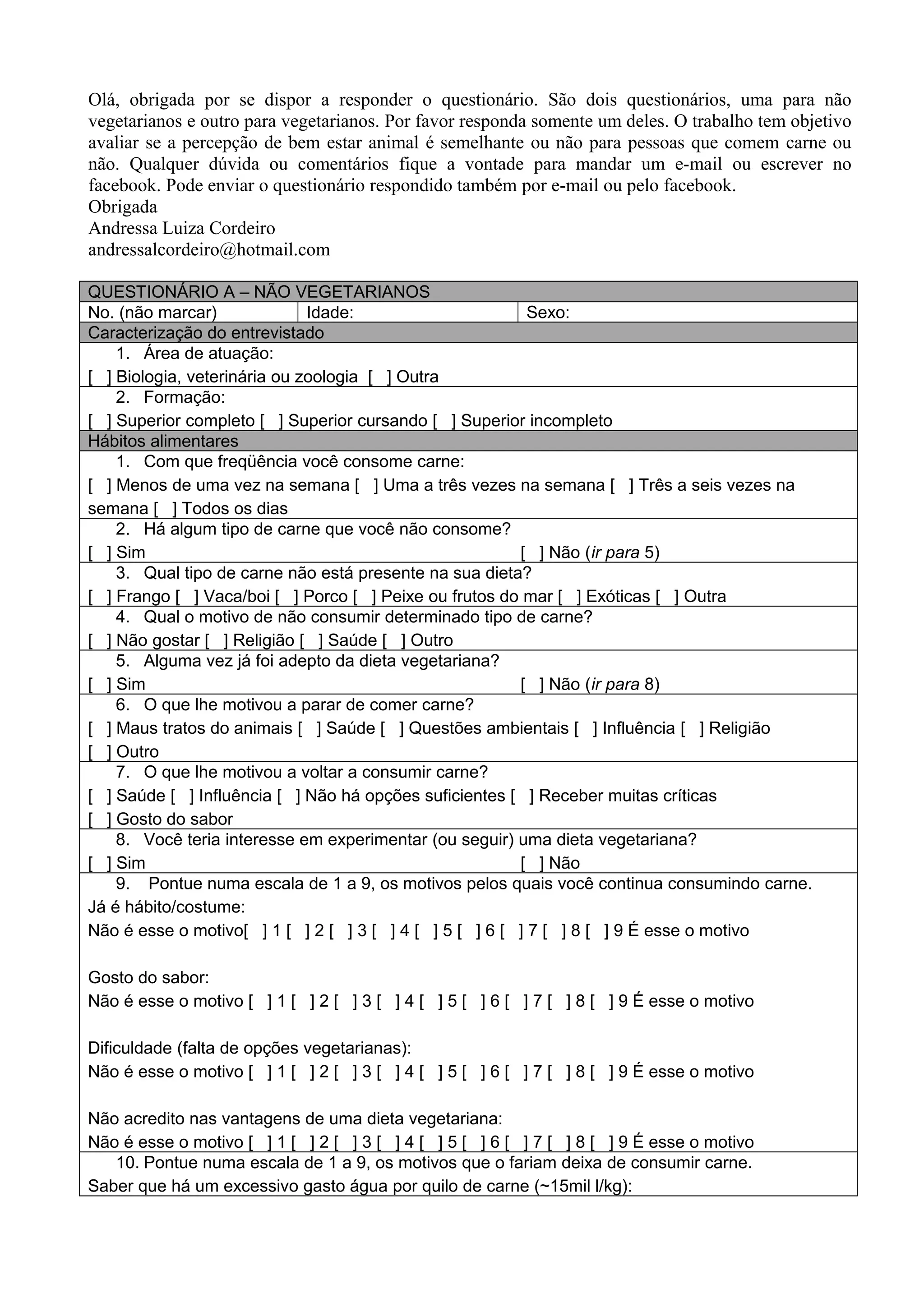 O documento apresenta dois questionários, um para não-vegetarianos e outro para vegetarianos, com o objetivo de avaliar se a percepção de bem-estar animal é semelhante ou não entre os grupos. Os questionários abordam hábitos alimentares, motivação para adotar ou não uma dieta vegetariana, afinidade com animais e percepção sobre o tratamento de animais na indústria de carne.