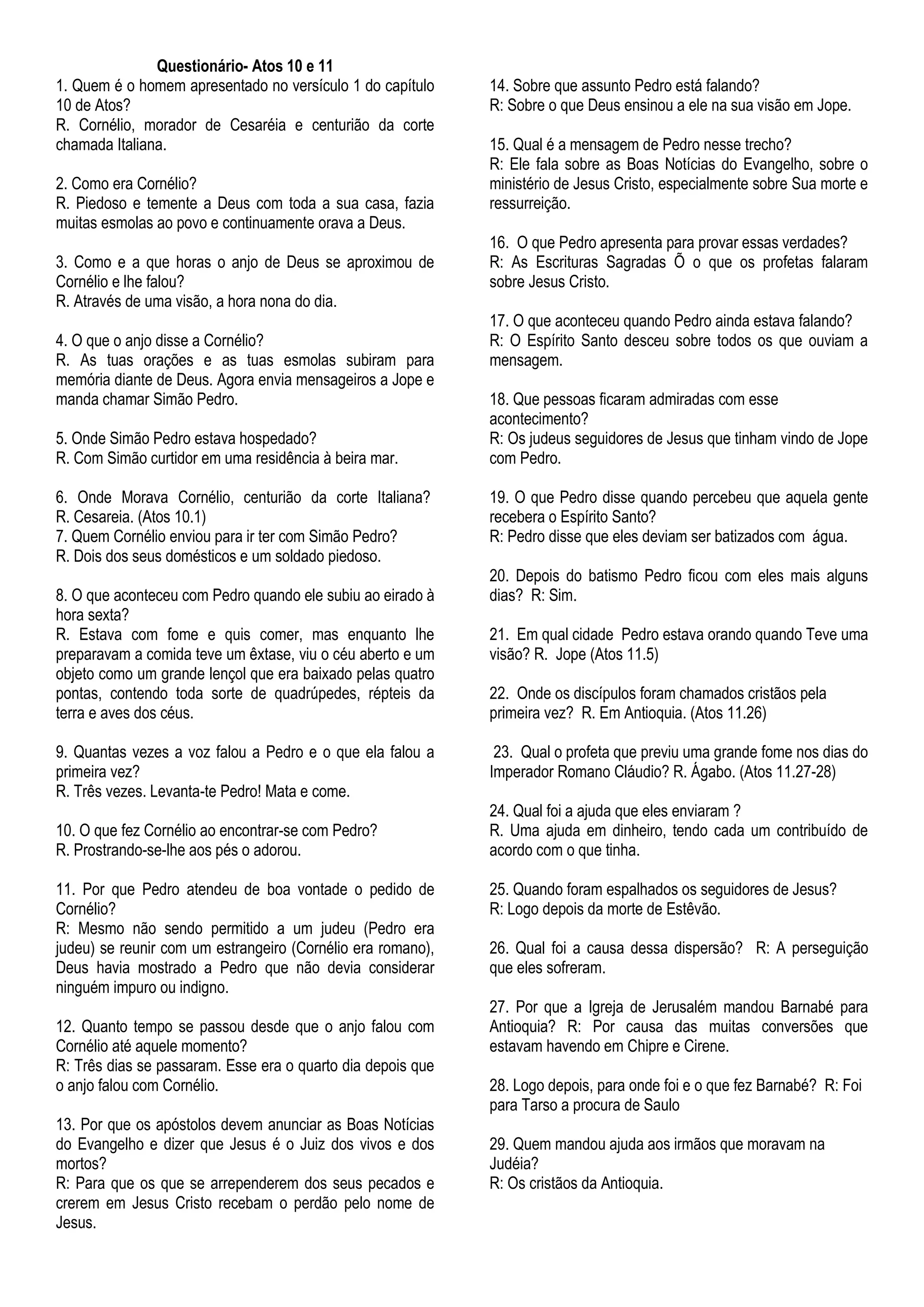 O documento resume um questionário sobre os capítulos 10 e 11 de Atos. Ele descreve Cornélio, um centurião romano piedoso que recebe uma visão para chamar Simão Pedro. Pedro então prega para Cornélio e sua família sobre Jesus, e o Espírito Santo desce sobre eles. Isso leva Pedro a concluir que Deus aceita também os gentios. O documento também discute a fome prevista por Ágabo e a ajuda enviada pela igreja de Antioquia.