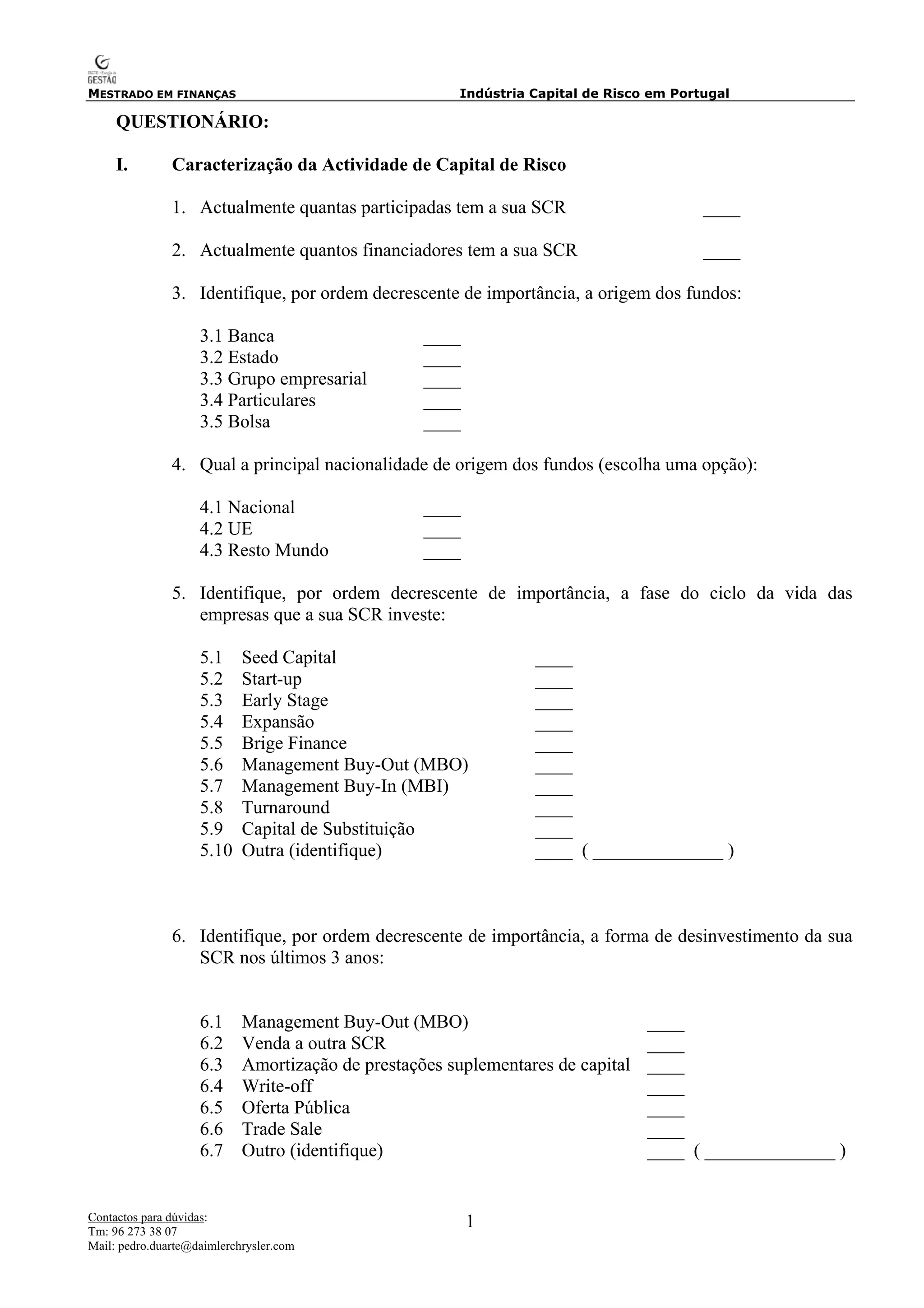 Este documento é um questionário sobre a indústria de capital de risco em Portugal. O questionário contém perguntas sobre as características das atividades de capital de risco, o processo de tomada de decisão de investimento, as fontes de informação utilizadas e o controle de participadas. O questionário é direcionado a empresas de capital de risco e busca entender seus processos, setores de investimento, origem de fundos e critérios para avaliação e controle de investimentos.