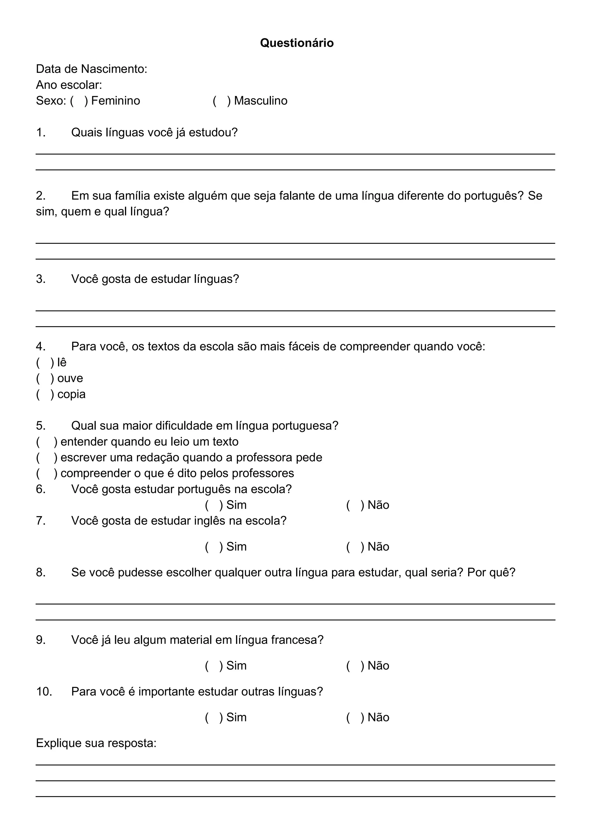 Este questionário solicita informações sobre o estudante, incluindo sua data de nascimento, ano escolar, sexo, línguas estudadas, dificuldades com línguas e preferências sobre quais línguas gostariam de estudar.