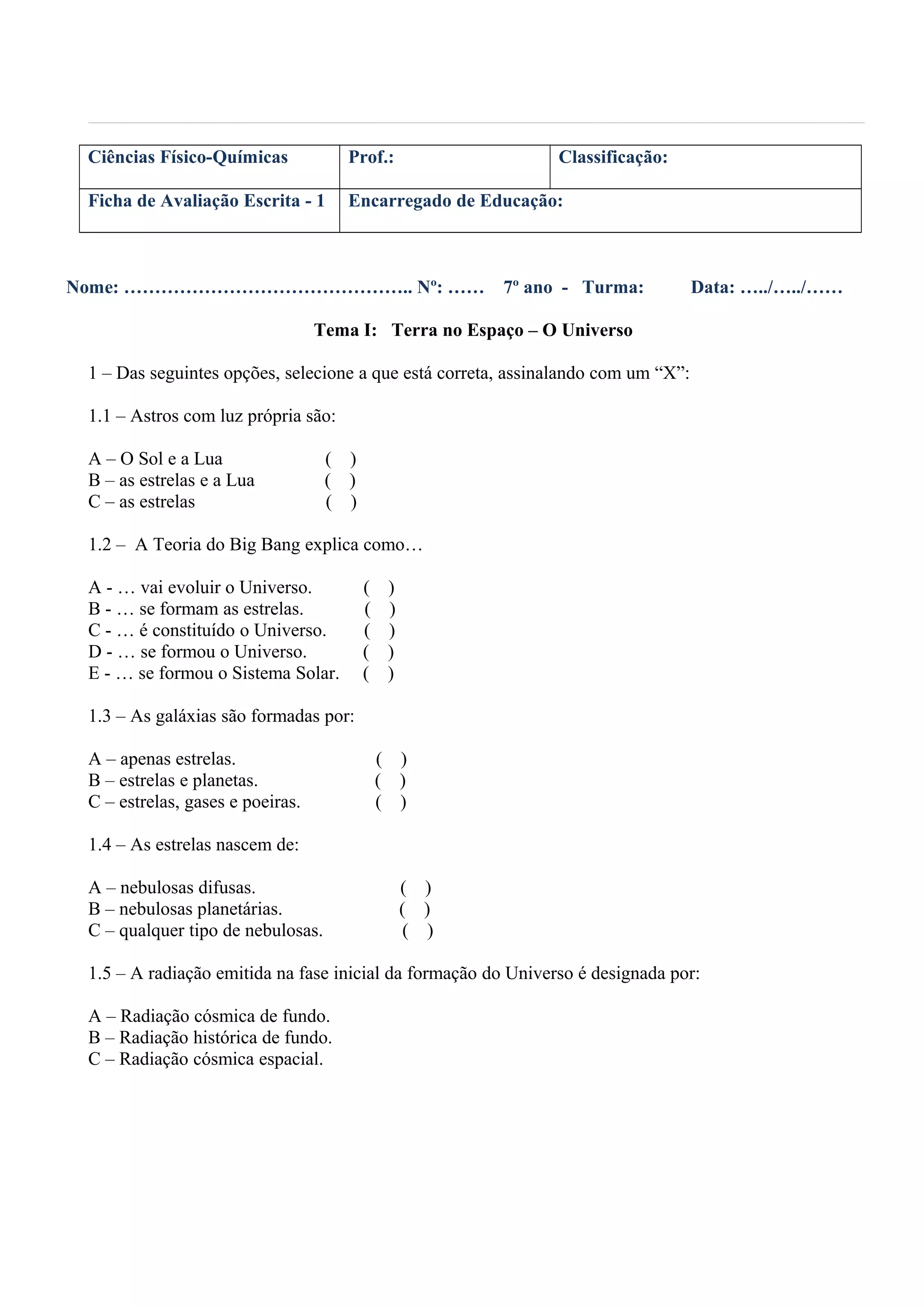O documento é uma prova de avaliação sobre o tema "Terra no Espaço - O Universo" com questões de escolha múltipla e de resposta curta sobre sistemas planetários, formação do universo, galáxias e estrelas. As questões abordam tópicos como a Teoria do Big Bang, características de objetos celestes como buracos negros e supernovas, e a utilização da Estrela Polar para navegação.