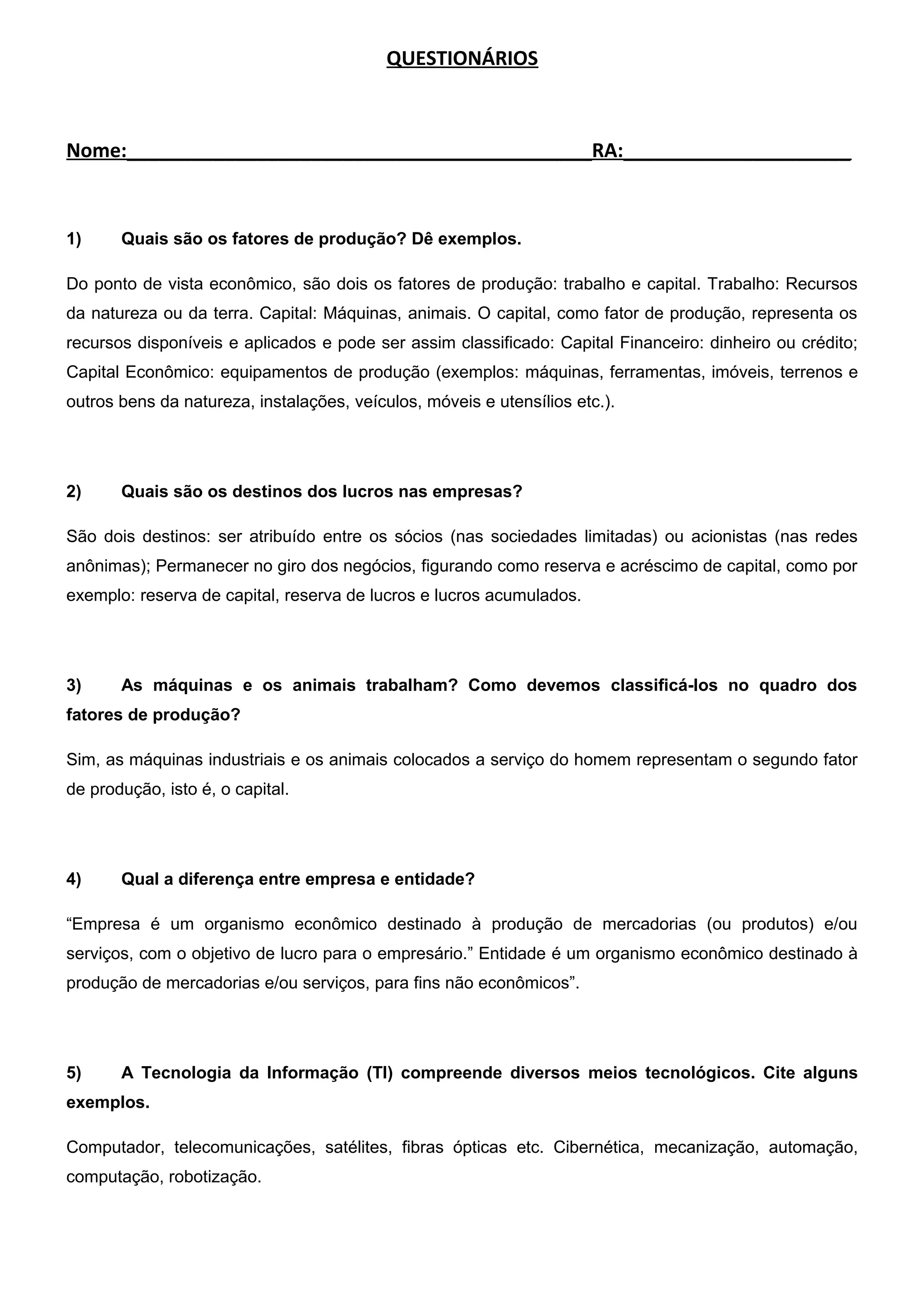 2) As perguntas abordam tópicos como fatores de produção, destinos de lucros, planejamento, organização, controle e outros processos administrativos.