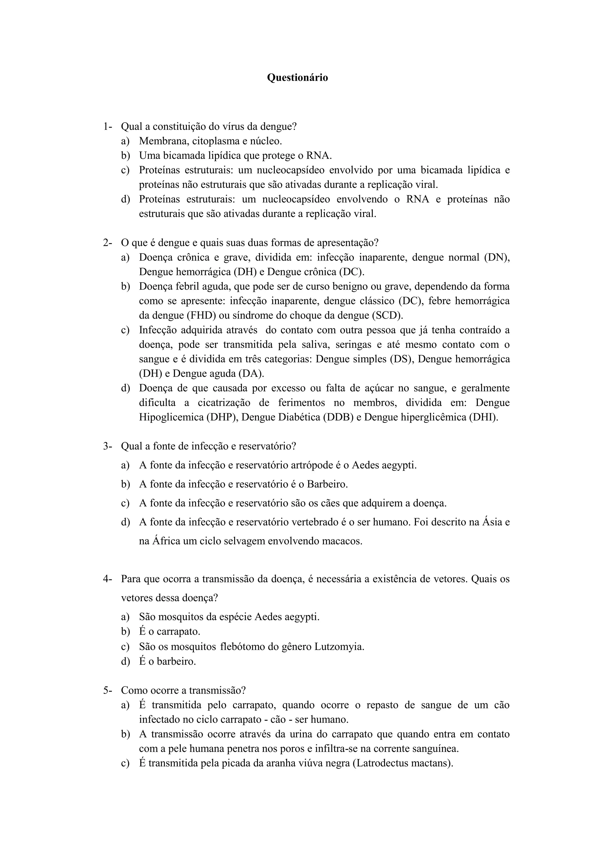 O documento é um questionário sobre dengue com 15 perguntas e respostas. A dengue é uma doença febril aguda transmitida pela picada do mosquito Aedes aegypti, que pode ter curso benigno ou grave dependendo da forma de apresentação: dengue clássico, febre hemorrágica da dengue ou síndrome do choque da dengue. O principal meio de prevenção é destruir os reservatórios de larvas do mosquito e realizar saneamento básico.